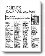 Every year FRIENDS JOURNAL puts together a four-page Annual Index that lists all of the authors, articles and subjects covered by the magazine the previous year. Each of these indices is in Acrobat portable document format. Get Acrobat Reader free from Adobe (check the system requirements to make sure you select the right version for your computer.) NOTE: Windows PC users can search these and other Acrobat files for keywords or author names by using the "Ctrl F" keyboard command then typing the word or phrase. Policy for requests for single copies of articles: If the issue in which the article is published is still in stock, we will send that issue. Use our Order Back Issues form or call us toll-free at (800) 471-6863 for details. If an issue is no longer in stock and the article is not copyrighted by the author, we can mail, fax, or scan and e-mail a single article for $3.00 for up to 10 pages, $0.25 per additional page. We are also happy to help you locate a library in your area where Friends Journal may be found. Call us toll-free at (800) 471-6863 for details. Please note that when an article is copyrighted by the author, we cannot offer photocopies or scans and will forward your request to the copyright holder.