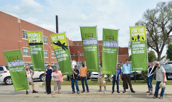 Governing Under the Influence (GUI) is a nonpartisan, strategic education and action project organized by American Friends Service Committee (AFSC). Started in October 2014, the project aims to spotlight corporate influence by training citizen volunteers to bird-dog (to follow and ask presidential candidates questions in their early public appearances in New Hampshire and Iowa) with a goal of influencing their positions. Too often the topics of state-sponsored violence and incarceration are not addressed by the mainstream media in political campaigns. When we bird-dog presidential candidates, we ask whether or not they will allow corporations to guide their decision making. By doing so, we educate and inform the candidates, the media, and the public about the issues.