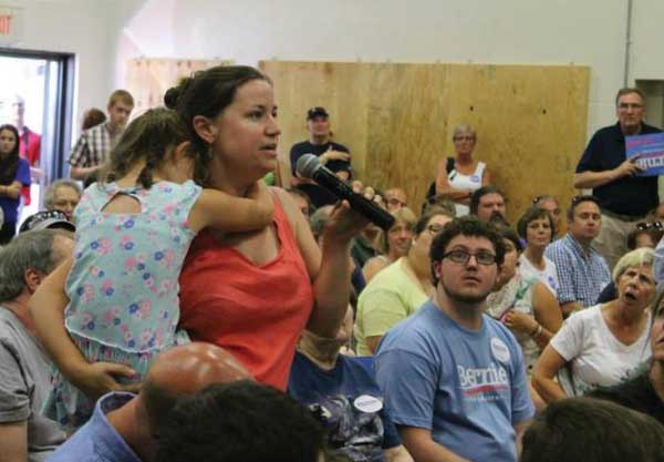 Here is an example of our candidate bird-dogging: a high school student from Scattergood Friends School in West Branch, Iowa, asked Democratic presidential candidate Hillary Clinton, “What steps will you take to stop wasting taxpayer dollars on government mandated bed quotas . . . in private non-union prisons which profit from exploiting immigrants, prisoners, and their workers?” Clinton was shocked and responded, “I’ll look into that question.” She then added, “Nobody has ever asked me that before.”