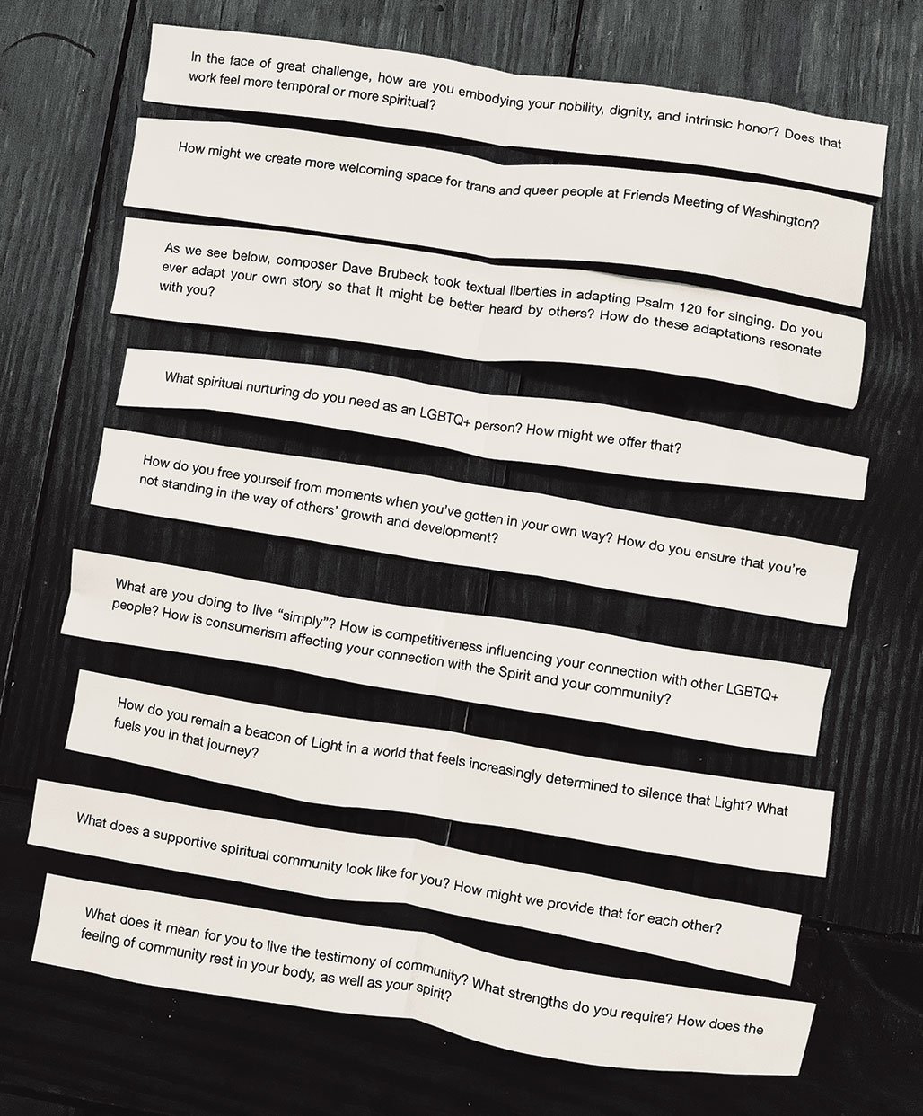 Al principio, creamos folletos con preguntas que buscaban cómo podría ser esta comunidad y cómo los Amigos deseaban proceder. Teníamos la intención de dejar de lado estas preguntas después de nuestras primeras reuniones a medida que la comunidad se solidificaba; sin embargo, los Amigos hablaron enérgicamente a favor de las indicaciones. Los folletos crecieron para incorporar citas de poetas, activistas y artistas queer de diferentes generaciones y culturas. Muchos encontraron que un breve extracto, algunos Amigos incluso podrían pensar en estos como “consejos», y una pregunta guía fueron útiles para establecerse rápidamente en un Meeting de mitad de semana que de otro modo podría estar ocupado por pensamientos sobre la jornada laboral y el viaje. Otros que no encuentran útil la pregunta siempre son bienvenidos a adorar como se les indique. Algunos han descubierto que desarrollar el siguiente conjunto de indicaciones puede ser un ejercicio espiritual generativo y gratificante en sí mismo.