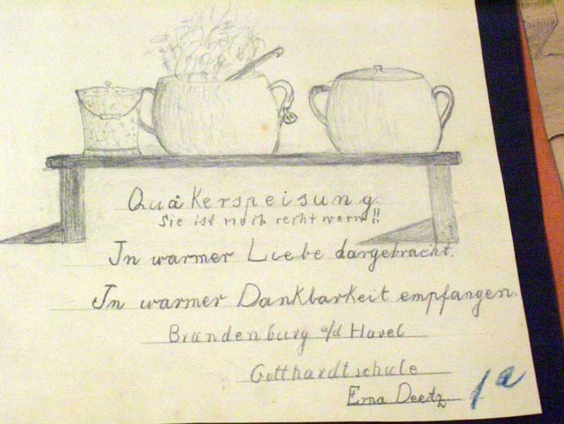 El esfuerzo de socorro posterior a la Primera Guerra Mundial fue Quakerspeisung, o alimentación cuáquera, supervisado por el American Friends Service Committee (AFSC) y su contraparte británica. En 1919, Herbert Hoover le pidió a AFSC que dirigiera un programa masivo de alimentación en Alemania. En cuatro años, el programa estaba alimentando a unos 500.000 niños por día, lo que finalmente impactó a un millón. La historia nos dice que la devastación pronto volvería con la Segunda Guerra Mundial, sin embargo, el vínculo de servicio y gratitud entre los niños alemanes y los trabajadores de socorro cuáqueros y no cuáqueros fue real.