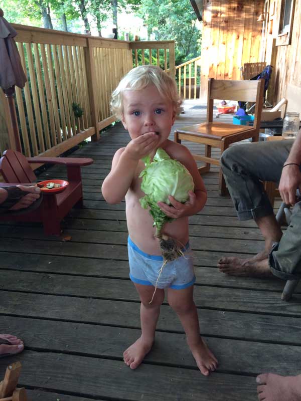Para algunos de nosotros, pertenecer a Sun Moon Farm es una oportunidad para ensuciarnos las manos. Muchos miembros visitan la granja para ayudar con el trasplante o la cosecha semanal. A mi joven vecina Ellie (de seis años) le gustan especialmente las zanahorias que ayudó a entresacar el año pasado y le encanta ayudar a los clientes a pesar sus productos y llenar sus bolsas cada semana.