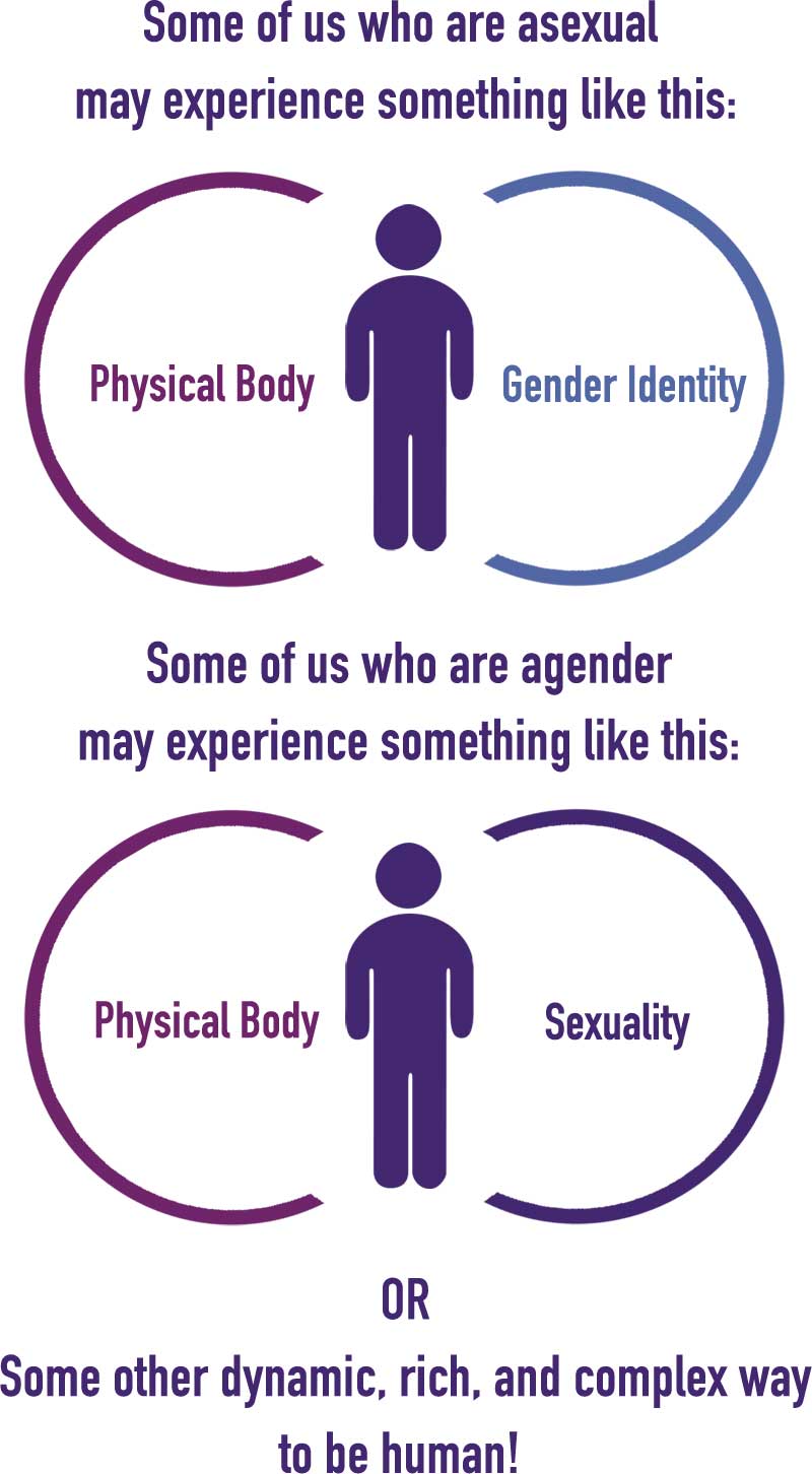 Al igual que nuestros cuerpos son generizados desde el principio y nuestro lenguaje dominante actual es limitado, también lo es nuestro lenguaje para la sexualidad, que también es generizado y limitado. A menudo, la sexualidad y la orientación sexual se utilizan indistintamente, pero son diferentes. La sexualidad, para aquellos de nosotros que no somos asexuales, abarca la sensualidad: lo que encontramos erótico, cómo experimentamos el placer y el deseo, lo que nos excita y nos hace llegar al orgasmo, y más. La sexualidad tiene que ver con cómo puedo disfrutar y disfruto de mi cuerpo físico, mi yo emocional y mi yo romántico, con o sin compartirme con otra persona. Para la mayoría de nosotros, nuestra sexualidad existe tanto si somos sexualmente activos como si no. Al igual que el género, nuestra sexualidad puede ser bastante estática durante nuestras vidas o puede cambiar y fluir de diferentes maneras en diferentes momentos de nuestras vidas. Nuestra experiencia de nuestra sexualidad puede estar profundamente influenciada por nuestro entorno, salud, círculos sociales, experiencias de violencia o violación sexual, envejecimiento, fe, cultura y más.