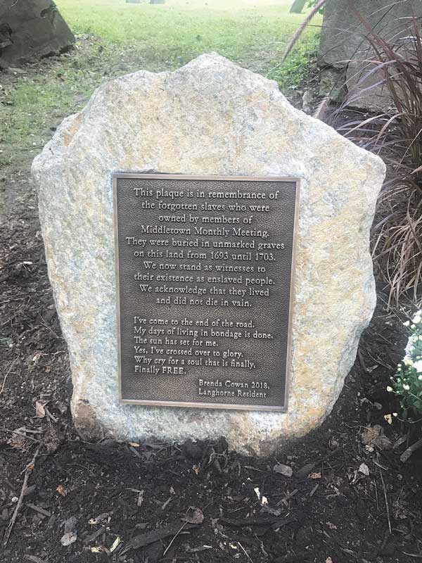 El sábado 6 de octubre, más de 300 personas asistieron a un servicio conmemorativo por los esclavos olvidados enterrados en la Casa de Reuniones de los Amigos de Middletown en Langhorne, Pensilvania. El servicio incluyó canciones interpretadas por un coro de la Universidad de Lincoln, una universidad históricamente negra cercana; la dedicación de dos placas conmemorativas que reconocen los sitios previamente no marcados; lecturas de cartas de manumisión, documentos legales que liberaron a los esclavos propiedad de los Amigos de Middletown; y un período de adoración abierta.