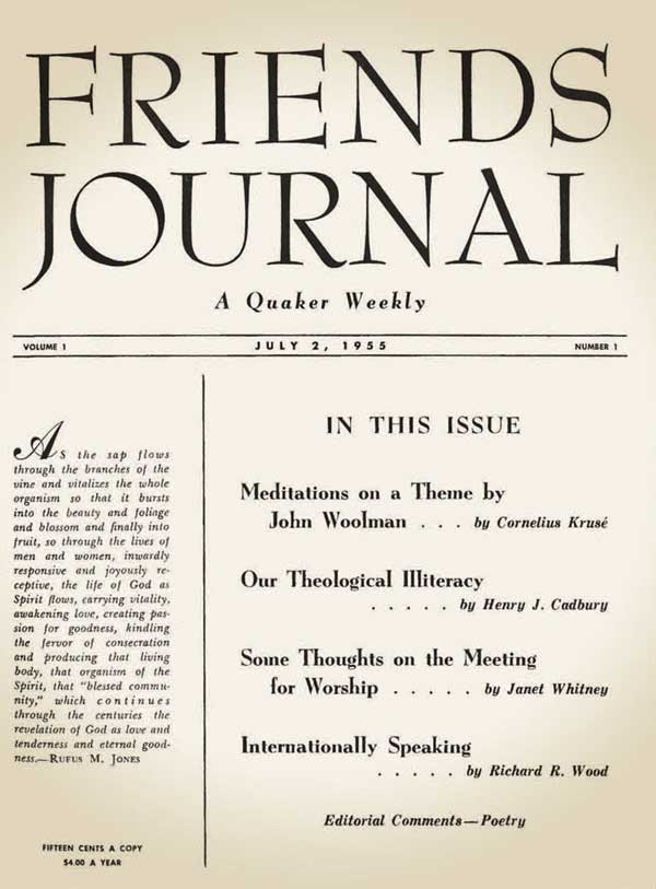 Friends Journal comenzó como un semanario el 2 de julio de 1955. Era en blanco y negro, todo texto excepto por un grabado en madera de tres Amigos diseñado por Fritz Eichenberg que sigue siendo nuestro colofón hasta el día de hoy. Una cita de Rufus Jones adornaba la primera portada, y las contribuciones incluían un ensayo sobre “Nuestro analfabetismo teológico» del célebre erudito Henry J. Cadbury y un poema benedictorio algo serio para la nueva publicación de William Bacon Evans. Una lista de corresponsales contribuyentes de “los Estados Unidos y el extranjero” buscaba “interpretar algunas de las ‘lecturas de temperatura’ actuales en los asuntos mundiales”. Un editorial esbozó los objetivos de la nueva revista: