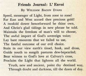 Friends Journal se esforzará por hablar de la situación espiritual del hombre moderno y apoyar, o estimular, las aspiraciones de nuestros meetings de adoración y los esfuerzos más tangibles de los Amigos en diversas líneas de esfuerzo práctico. Nuestro nuevo periódico necesita, a su vez, beneficiarse de la esencia espiritual que vive y crece en nuestro hogar, meetings y escuelas.