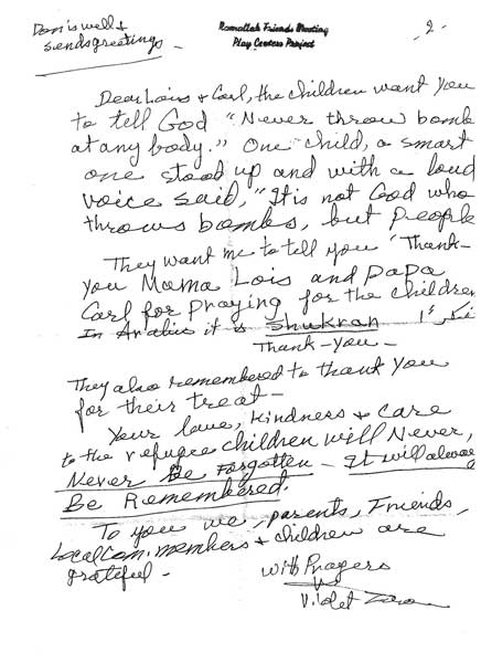 During a trip with a large Methodist group, three of us Quakers took a day out to visit Ramallah. I was beyond excited. We had meeting for worship in a classroom where I was overwhelmed with the sense of the presence of “a great cloud of witnesses.” (The meetinghouse at that time, 1995, was in very poor shape. It has since been transformed and is beautiful and welcoming.) Donn Hutchison, teacher in Ramallah for many decades, had us for a lovely meal in Swift House, then took us down the street to visit a young man named Ghazwan Khairi and his parents, where we made friends over cake and tea. For three years, Carl and I had contributed a modest sum to Ghazwan’s school expenses. Then on down the street, we went to the home of Violet and Leila Zaru, sisters who lived in the house their father had built. They had been students of Aunt Mildred’s, and here, too, we were met with love and welcome. My cousin Esther White Sunderland and I had corresponded with Violet for several years, sometimes sticking a $20 bill in the envelopes for something for the children in the Amari refugee camp. Violet always replied with gratitude, saying, “I told the children that even people from far away care about them!”