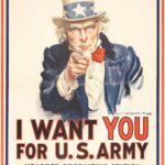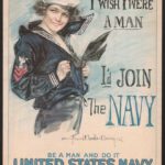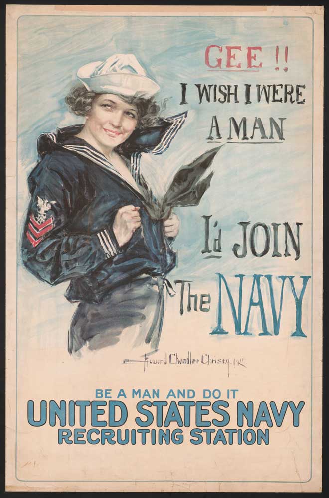 Other images of German aggression are followed by recruiting posters, including the iconic “Uncle Sam Wants You” by illustrator James Montgomery Flagg and the now eye-roller picture of a darling young woman in a sailor suit saying, “Gee!! I wish I were a man; I’d join the Navy” by Howard Chandler Christy.