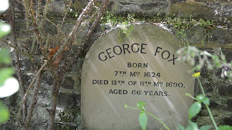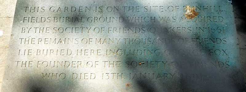 Burial marker for George Fox in Bunhill Fields, first placed in 1881 then moved in 1952 to the meetinghouse garden wall. "11 Month 1690" is January 1691 in the modern calendar. © Matt Brown, flickr.com/londonmatt