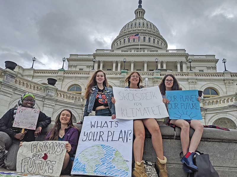 Kallan Benson (second from left), Sophia Geiger (center), and three other strikers at the U.S. Capitol, April 2019. Photo © Carl Benson.