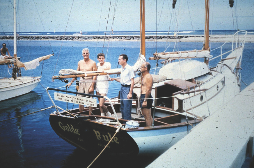 Golden Rule in 1958. From left to right: Captain Albert S. Bigelow, Orion Sherwood, WIlliam Huntington, and George Willoughby. Courtesy Jessica (Reynolds) Renshaw.