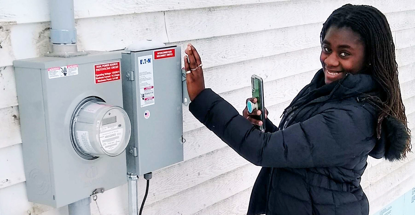 Hazel flipping the switch to turn on Kat and Soren's solar electricity generation system. Photo by Soren Hauge.