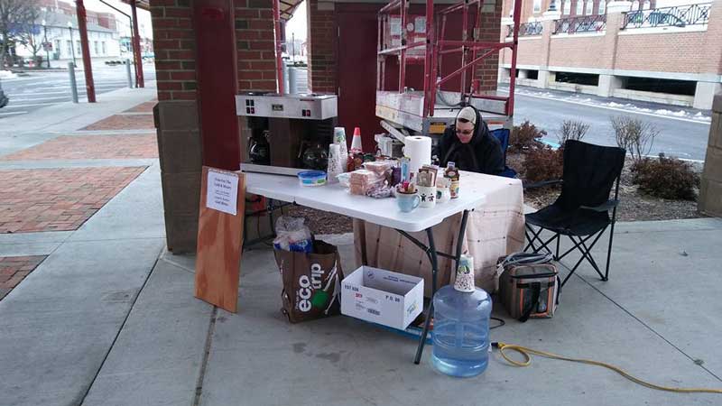 Majira ya baridi kali tatu zilizopita, baada ya kupoteza kikundi cha wajitoleaji wasio na makao katika jiji kubwa, tulikuwa tukitafuta kikundi kipya katika mji wetu mdogo. Siku moja tuliamua tu kuweka meza yetu wenyewe katikati mwa jiji, tukifikiri hata kama tungeweza kutoa kahawa na siagi ya karanga na sandwichi za jeli, ilikuwa bora kuliko kufanya chochote. Tulienda kila Siku ya Kwanza, na baada ya wiki chache tulikuwa tumetayarisha vifaa vyetu na tulikuwa tukihudumia watu wapatao 20 kila safari.